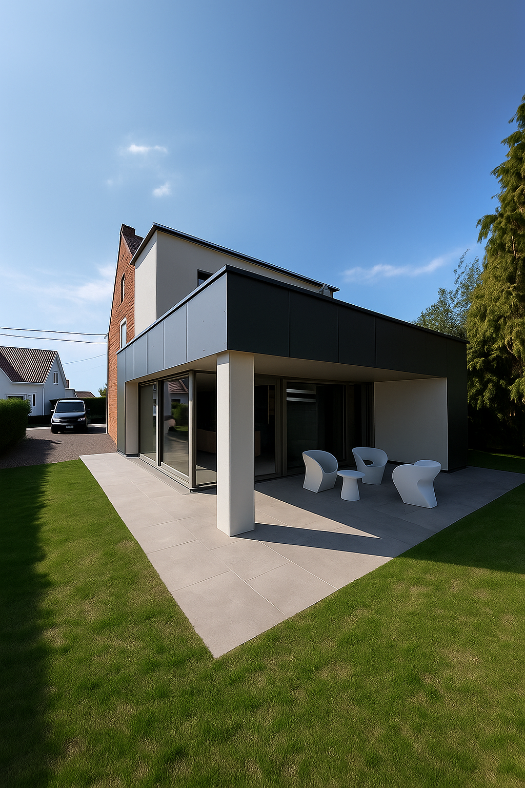 De opdracht bestond uit het realiseren van een nieuwe achterbouw met een sterke focus op de connectie met de tuin. Omdat de bewoners vooral buiten leven, was het belangrijk om zowel de relatie met de tuin te optimaliseren als een volwaardige achterinkom te creƫren. Het resultaat is een achterbouw die zich volledig opent naar het groen en plaats biedt voor een aparte inkomsas. Een deels overdekt terras maakt het mogelijk om ook bij slecht weer van de buitenruimte te genieten. De grote raampartijen zijn zo ontworpen dat de volledige hoek kan worden opengeschoven, waardoor binnen en buiten naadloos in elkaar overvloeien.